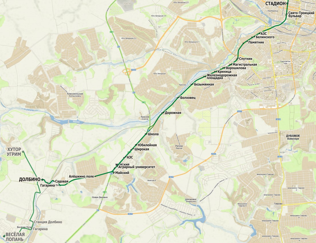 - Кооперативная (Долбино) - Школьная (Долбино) - Каштановая (Майский) - М2 «Крым» - Магистральная - Красноармейская - Б. Хмельницкого -